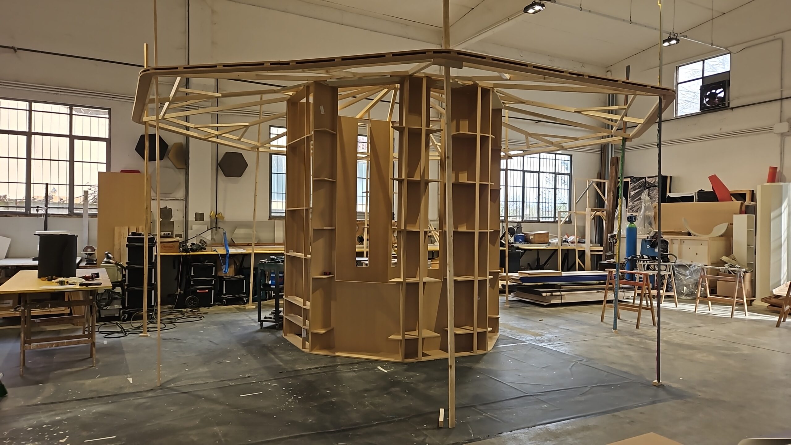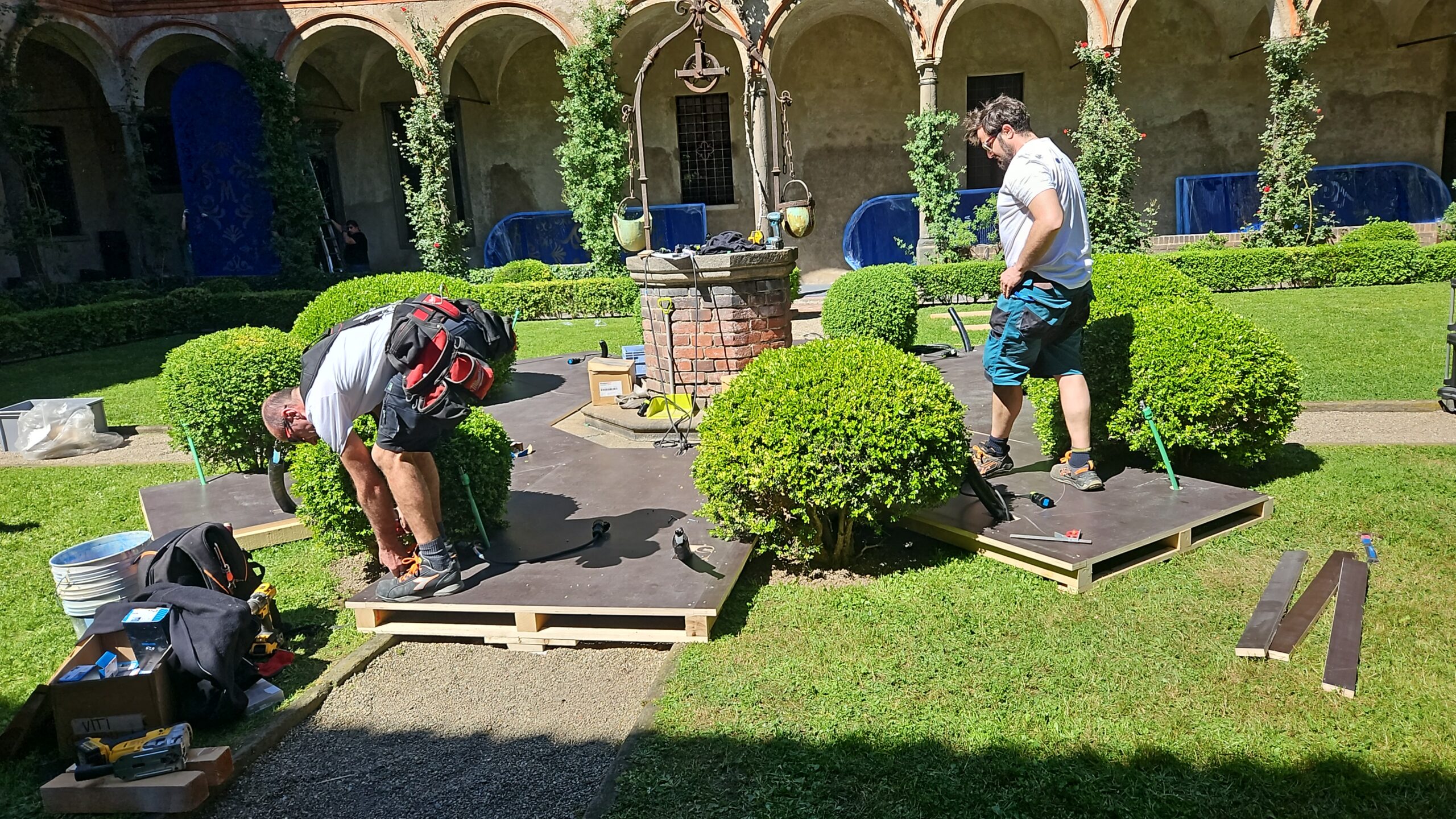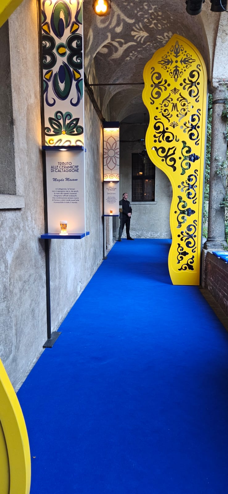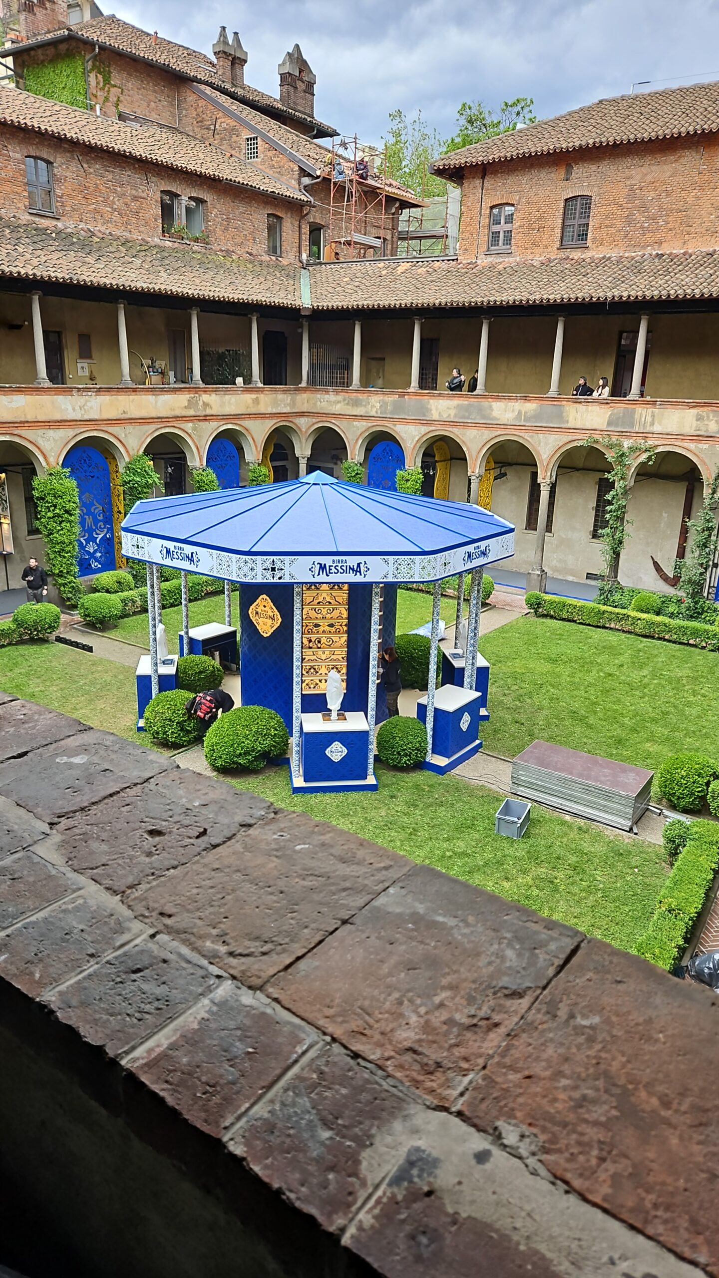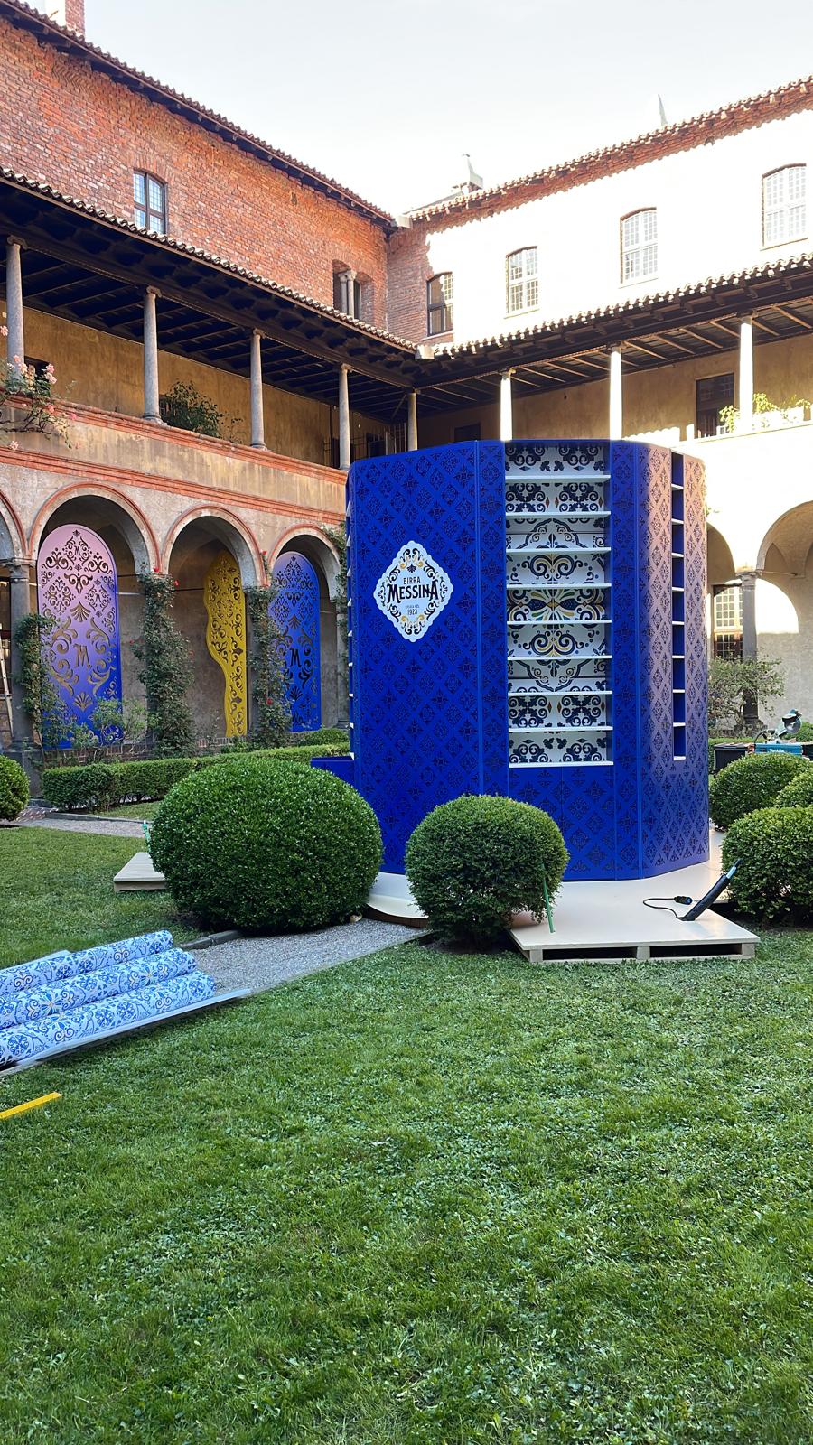 Un allestimento scenografico è stato realizzato presso il Chiostro Cappuccio di Milano per il progetto “Bar Meraviglia”, firmato dallo studio Gio Forma per All Communication. L’intervento si sviluppa attorno al pozzo centrale, con una struttura ottagonale progettata per integrarsi con gli arbusti esistenti e valorizzare lo spazio storico. Le pannellature in MDF trattato e traforato, con texture ispirata al brand, sono state progettate per inserirsi negli archi del porticato, mentre espositori sospesi rifiniti in calce cruda stampata accolgono la collezione di bicchieri.