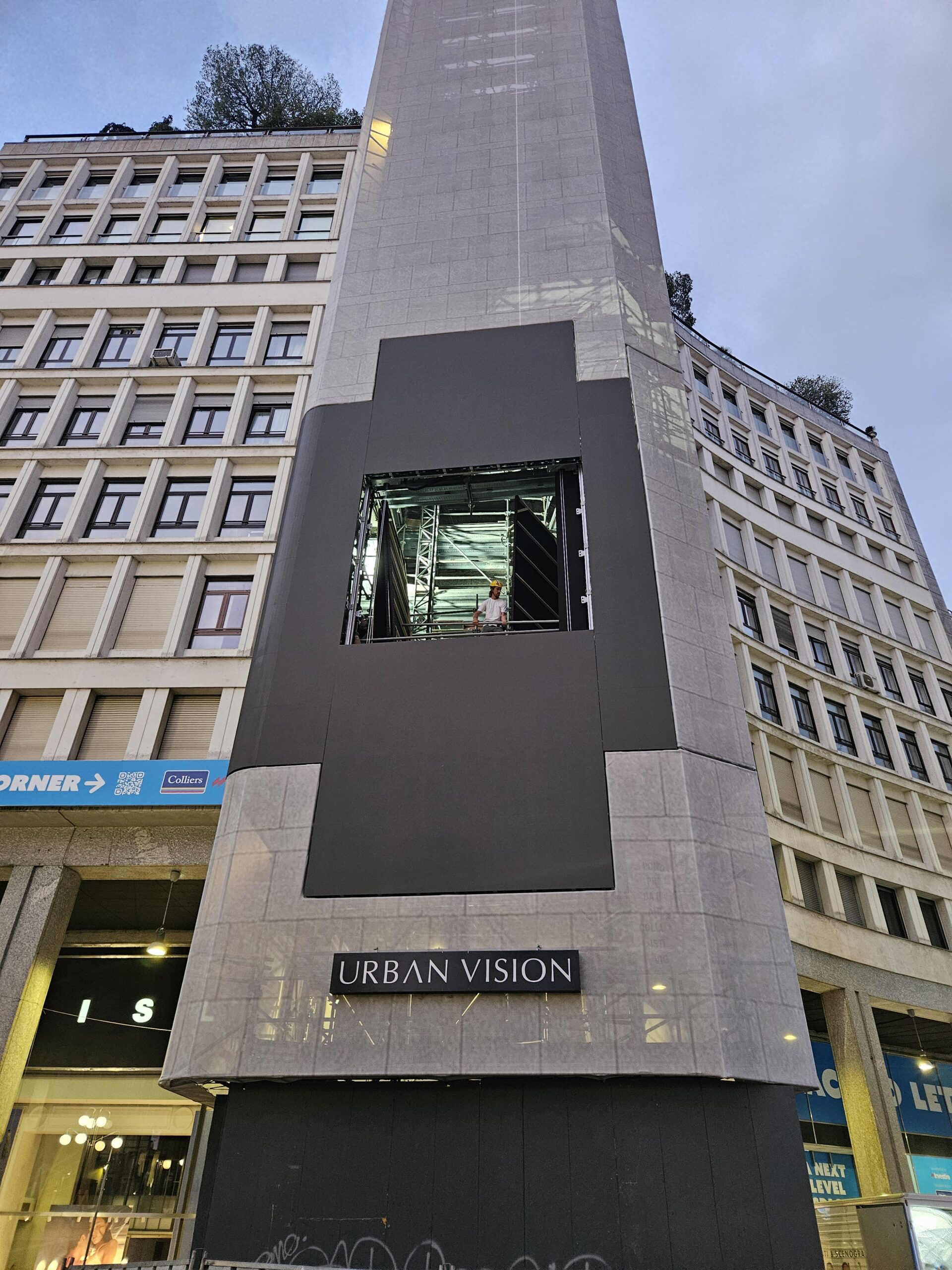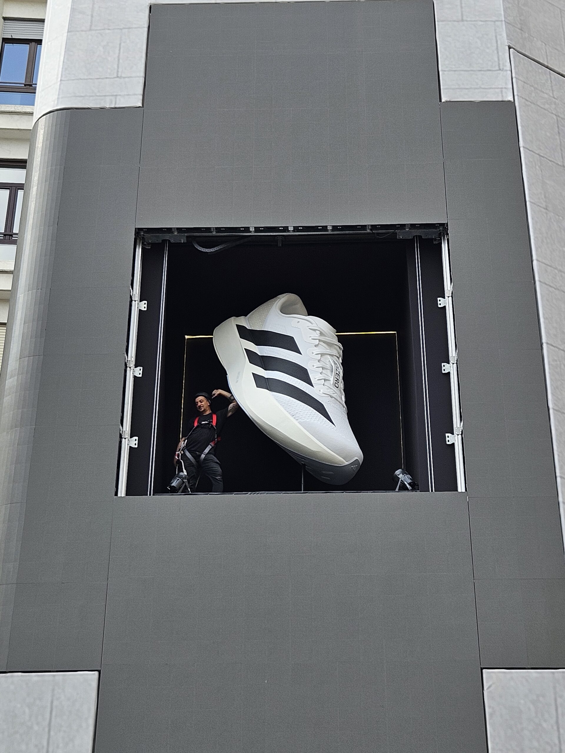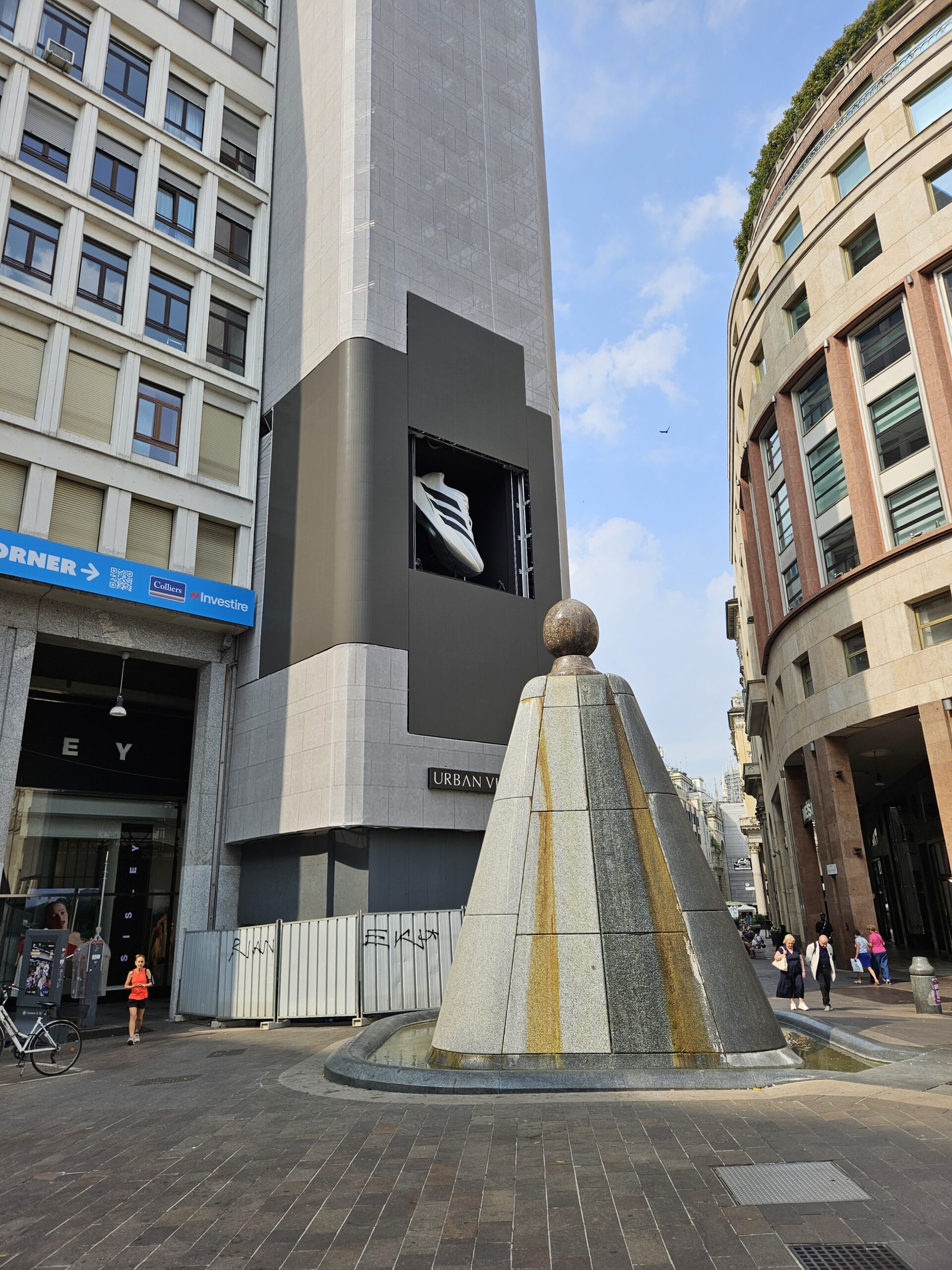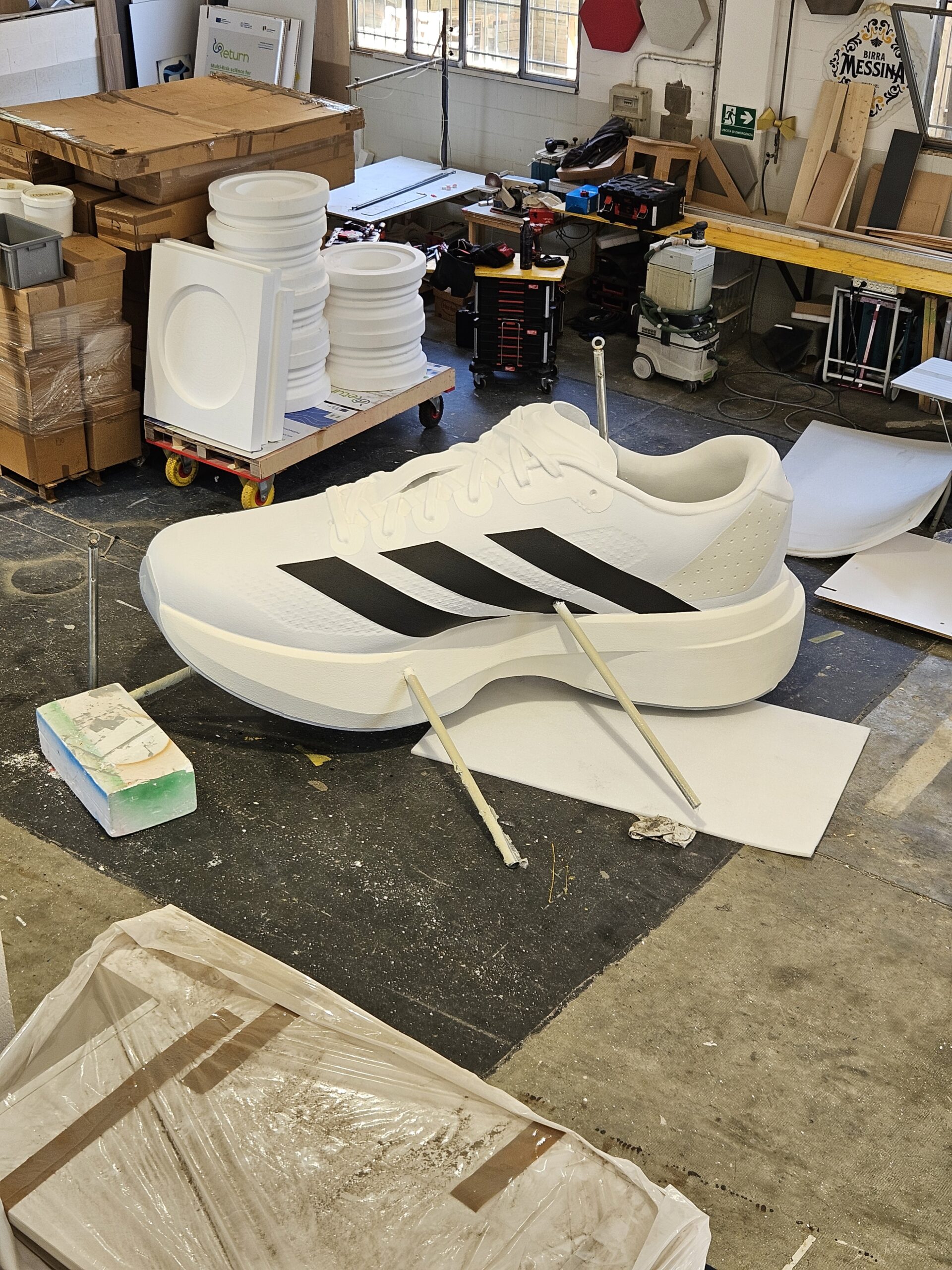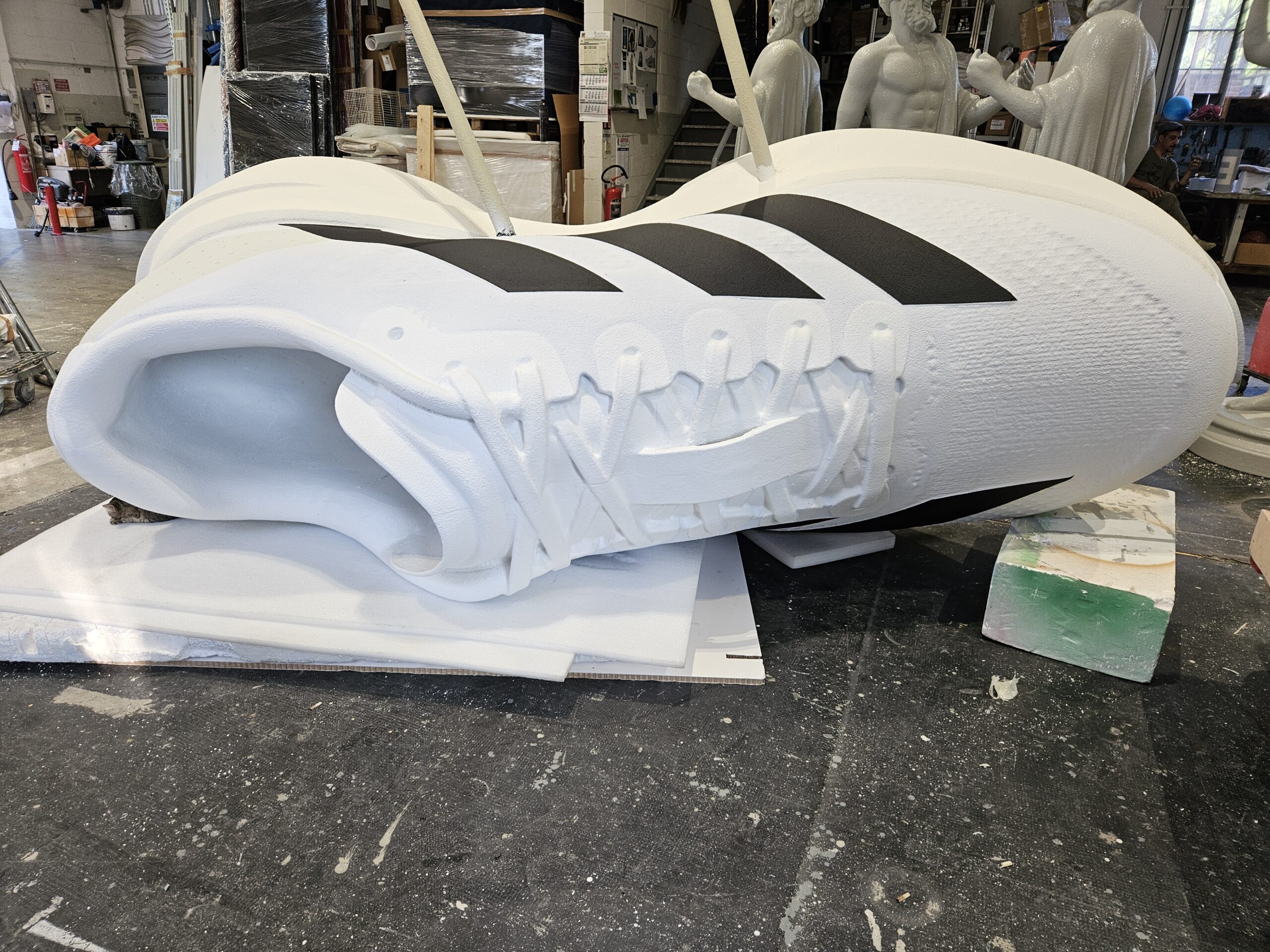 Un mock-up oversize di una sneaker iconica è stato realizzato per un noto brand sportswear e installato all’interno del ledwall di Piazza San Babila a Milano. L’installazione, sviluppata a partire da un modello 3D con simulazioni di posa, è stata prodotta in polistirolo fresato con braccio robotico KUKA, resinato con finitura flessibile e rifinito attraverso uno studio cromatico ad alta precisione. Un’armatura interna progettata ad hoc consente di mantenere l’inclinazione definita in fase progettuale, garantendo stabilità e coerenza visiva.